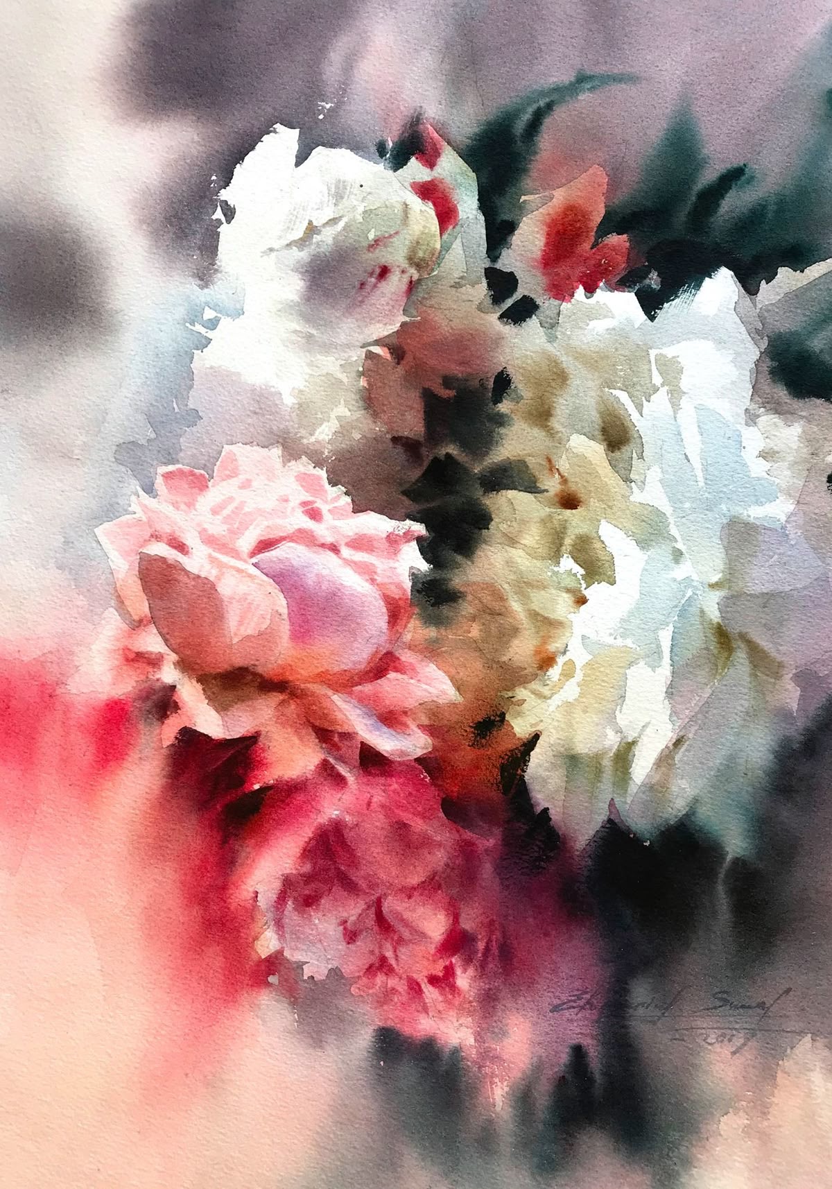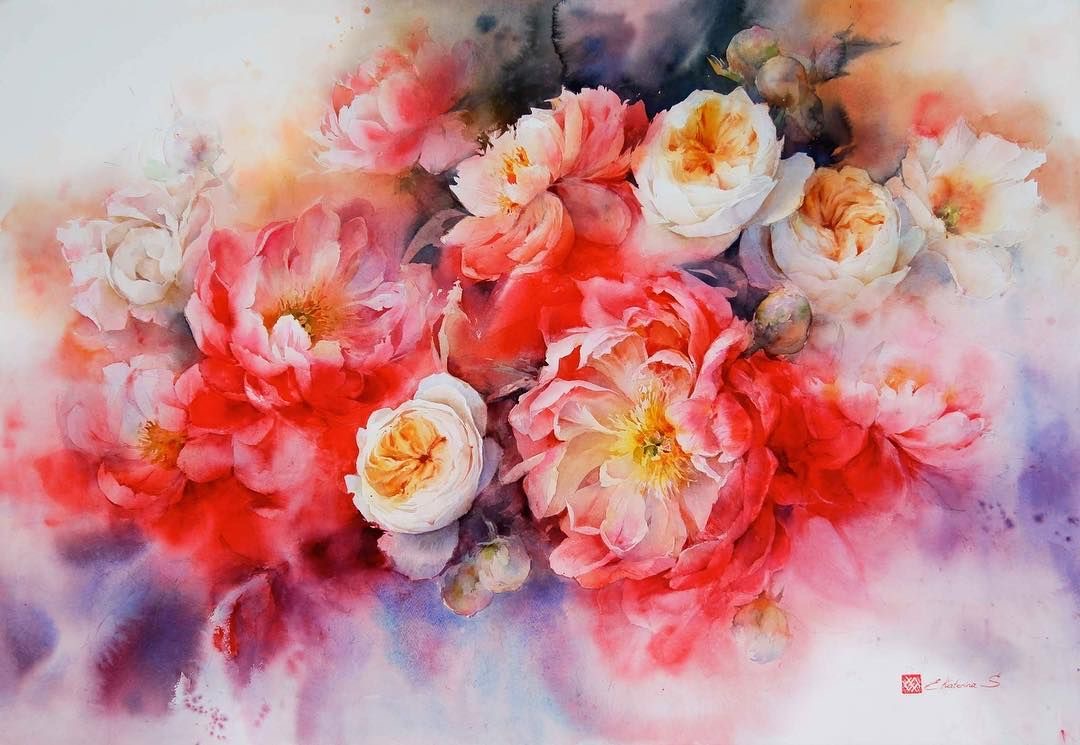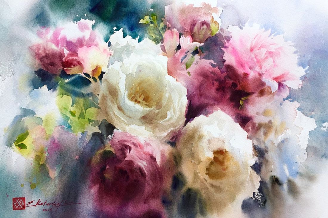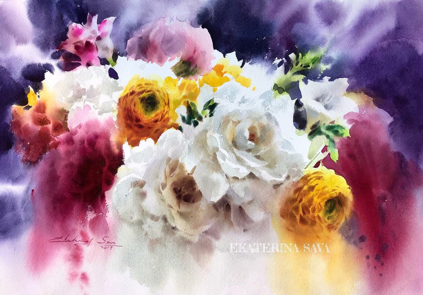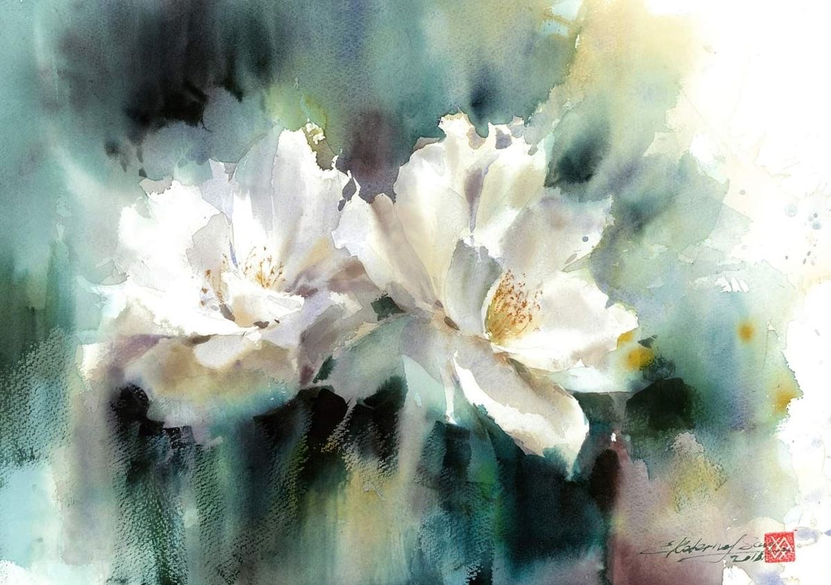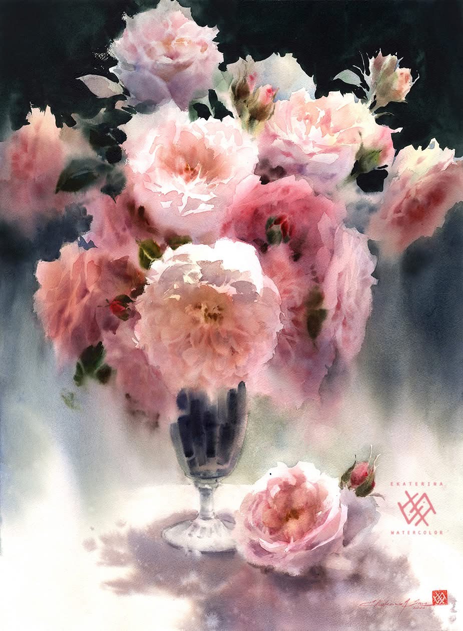 Su trabajo se centra principalmente en flores y naturalezas muertas, abordadas desde una mirada atenta a la luz, el aire y la sencillez de lo cotidiano. Para Ekaterina, la acuarela no es un medio para construir artificios, sino una forma honesta de observar el mundo: “La singularidad del mundo de la acuarela no está en crear una ilusión artificial, sino en permitir distinguir toda la simplicidad y ligereza de nuestro entorno. La pureza de las líneas naturales, la frescura de las combinaciones de color no artificiales y la presencia invisible del aire están encarnadas en las obras de esta técnica.”
