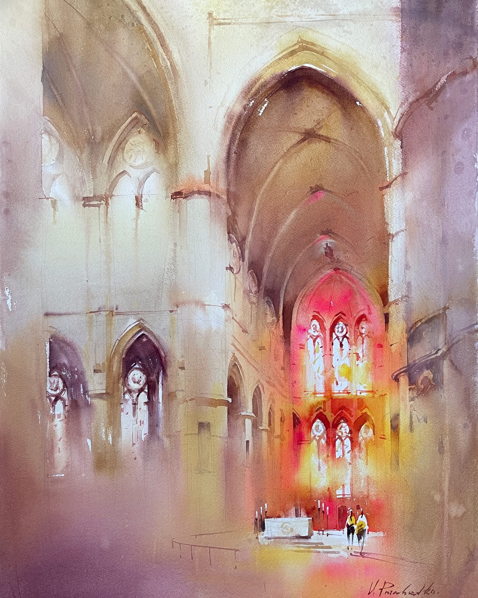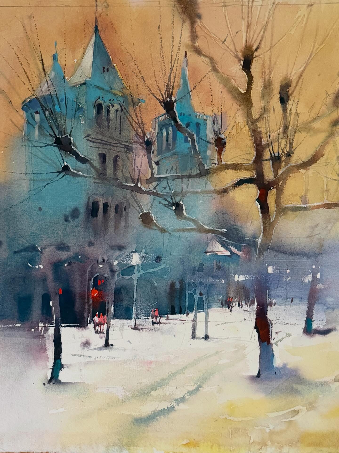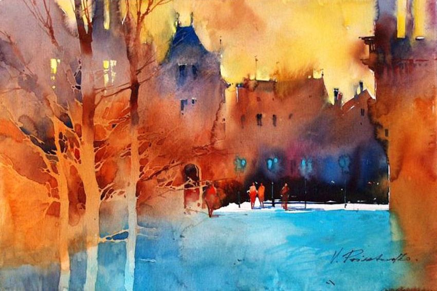 Viktoria Prischedko (Kishinev, Moldavia, 1964). Es una pintora internacionalmente reconocida por su excepcional trabajo en acuarela, especialmente en escenas urbanas y paisajes con una sensibilidad poética y técnica notable. Se formó en la Academia de Bellas Artes de Kiev (Ucrania) y en la Escuela de Arquitectura del Monumento en Trieste, combinando formación arquitectónica con una profunda expresividad pictórica.