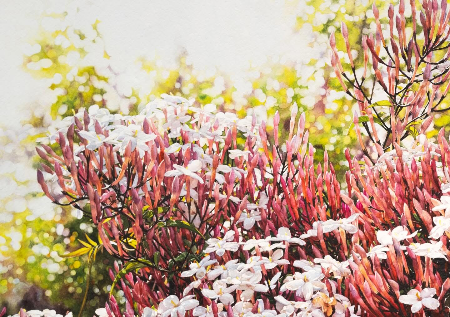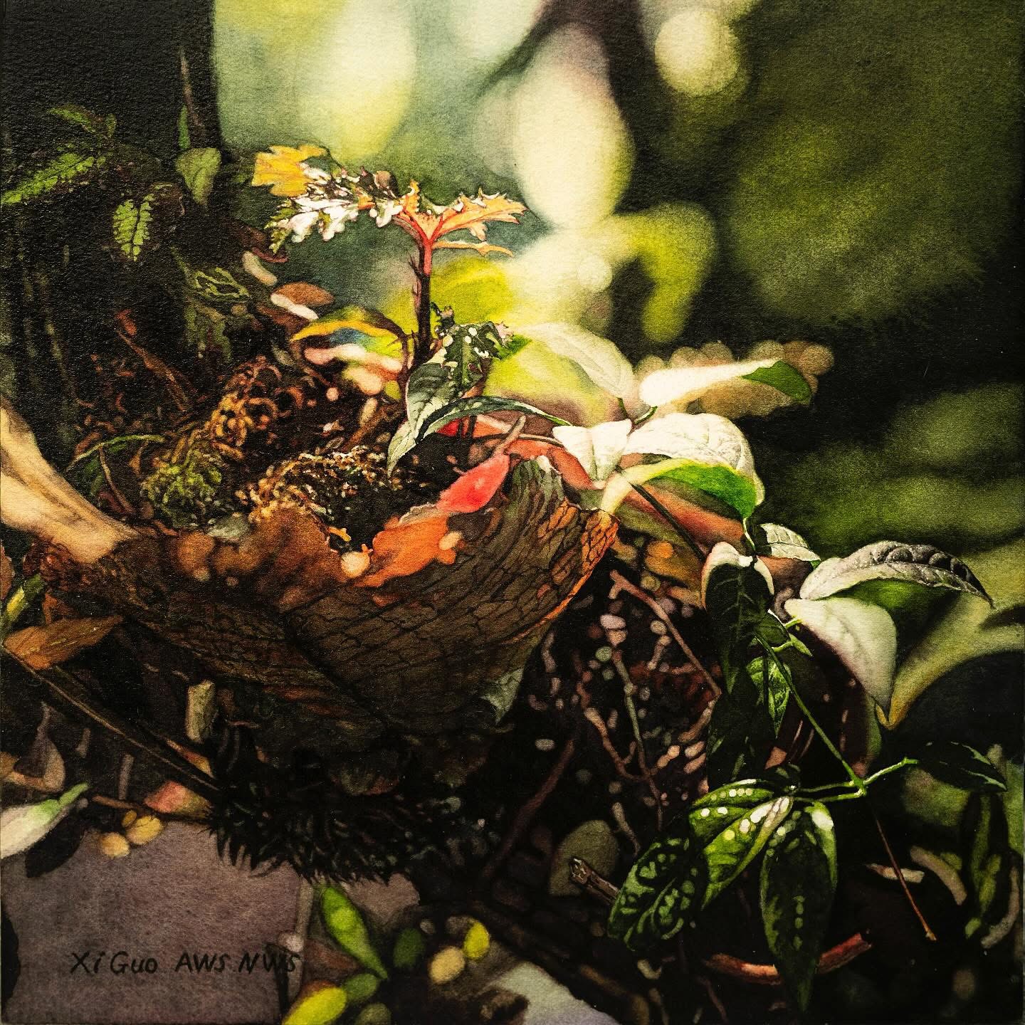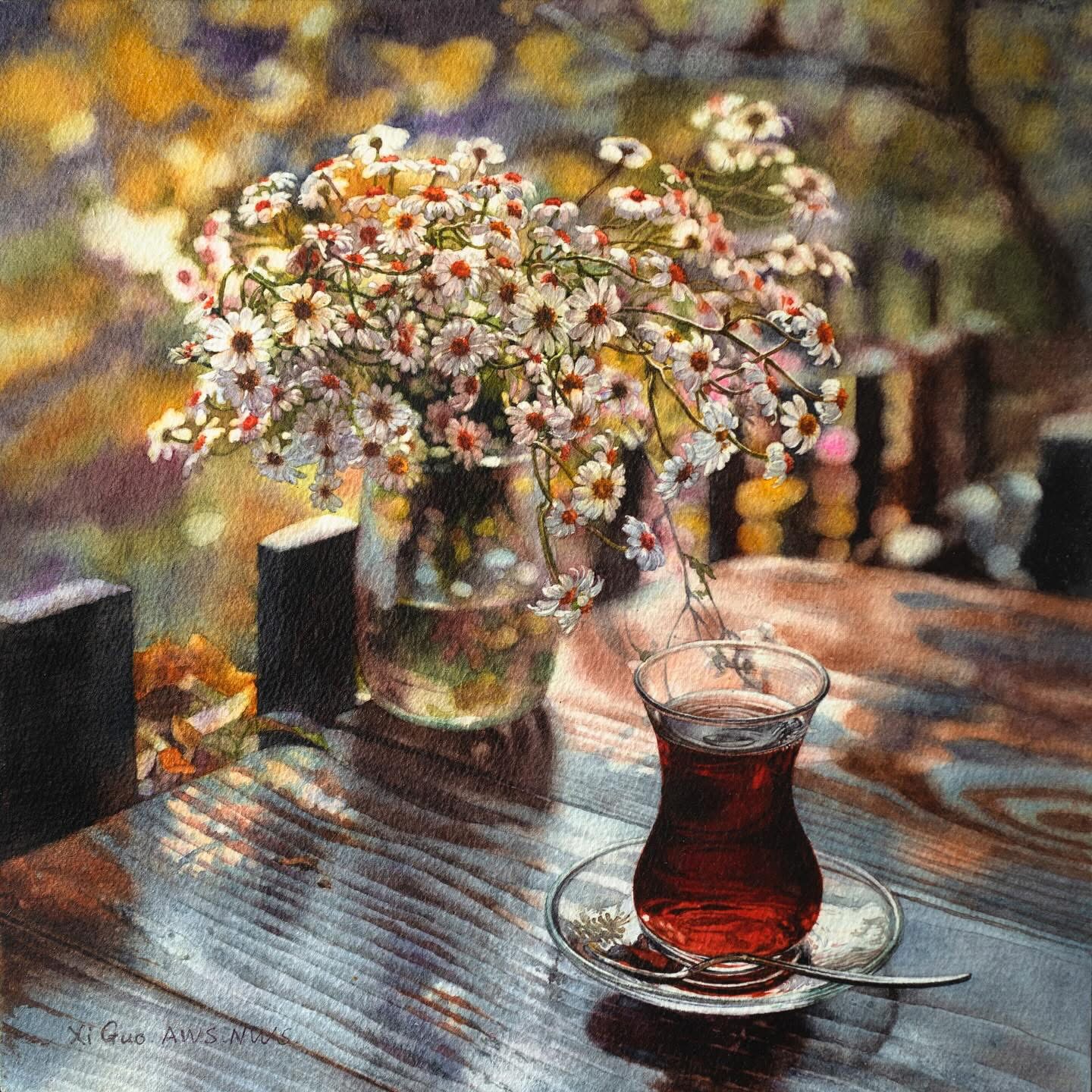 Xi Guo (Shanghai, China, 1975) es una gran acuarelista y artista visual radicada en St. Augustine, Florida (EE.UU). Creció en Shanghái, estudió pintura al óleo en Shanghai Normal University y luego se especializó en fotografía en EE.UU. Su interés en la acuarela surgió hace más de una década, cada acuarela refleja su atención al detalle, la sutileza de la luz y el color, y una mirada íntima hacia la naturaleza y la fugacidad de la vida, como lo dice ella misma: “Mis pinturas buscan llevar al espectador fuera de sí mismo, aunque sepan que todo es efímero; la acuarela, con su transparencia, incertidumbre y fragilidad, me permite expresar ideas y sentimientos de manera sutil y directa.”